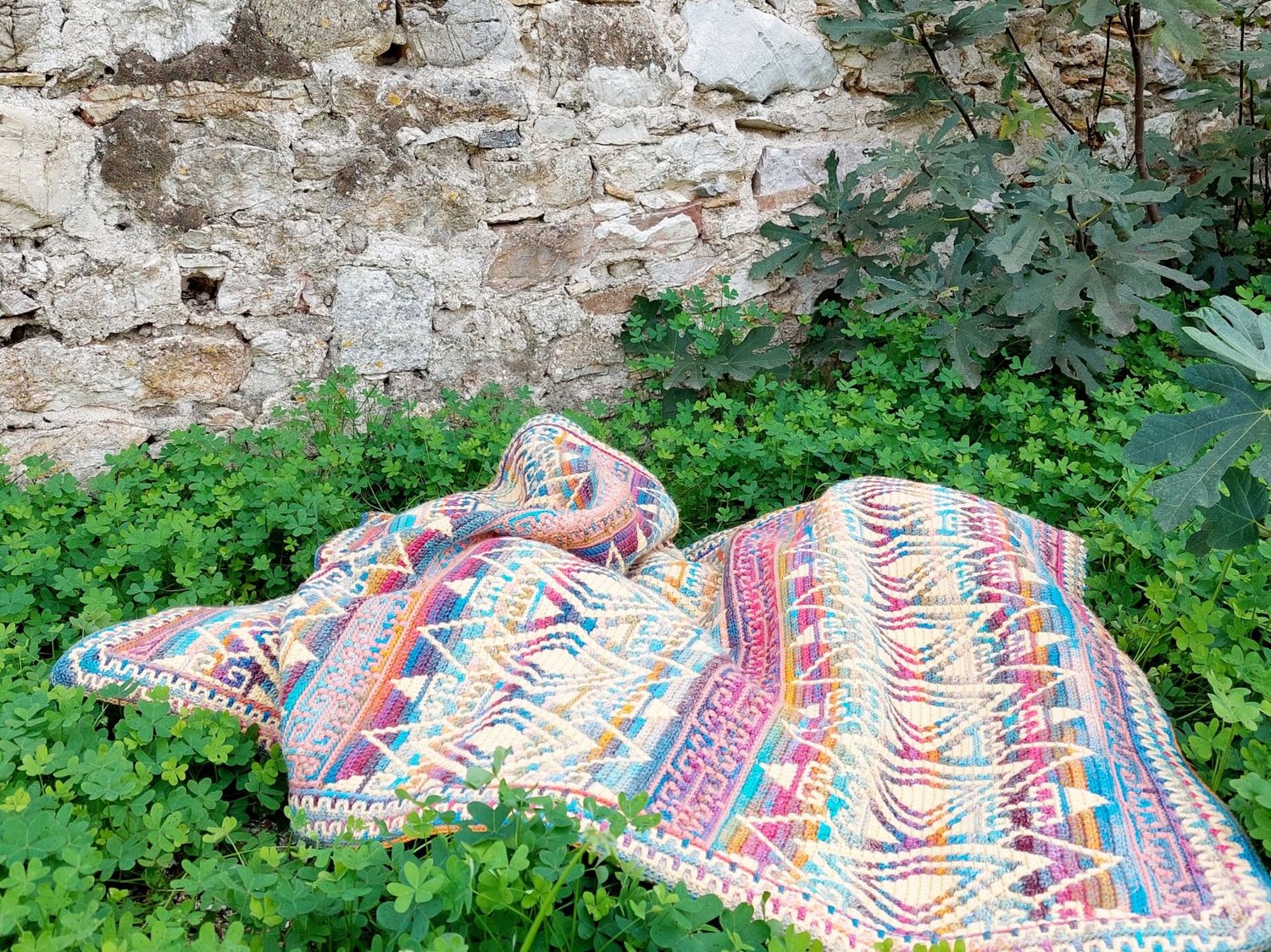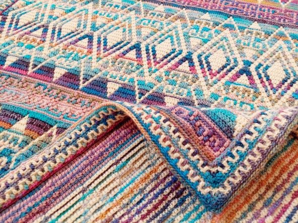 Mosaic crochet pattern ANCIENT STORIES combines simple geometric shapes with ornaments to create an eye-catching result! The pattern allows you to create any size blanket or other projects by adjusting the number of repeats in width and in height. Two layout variations are included; both go nicely with the included border pattern.